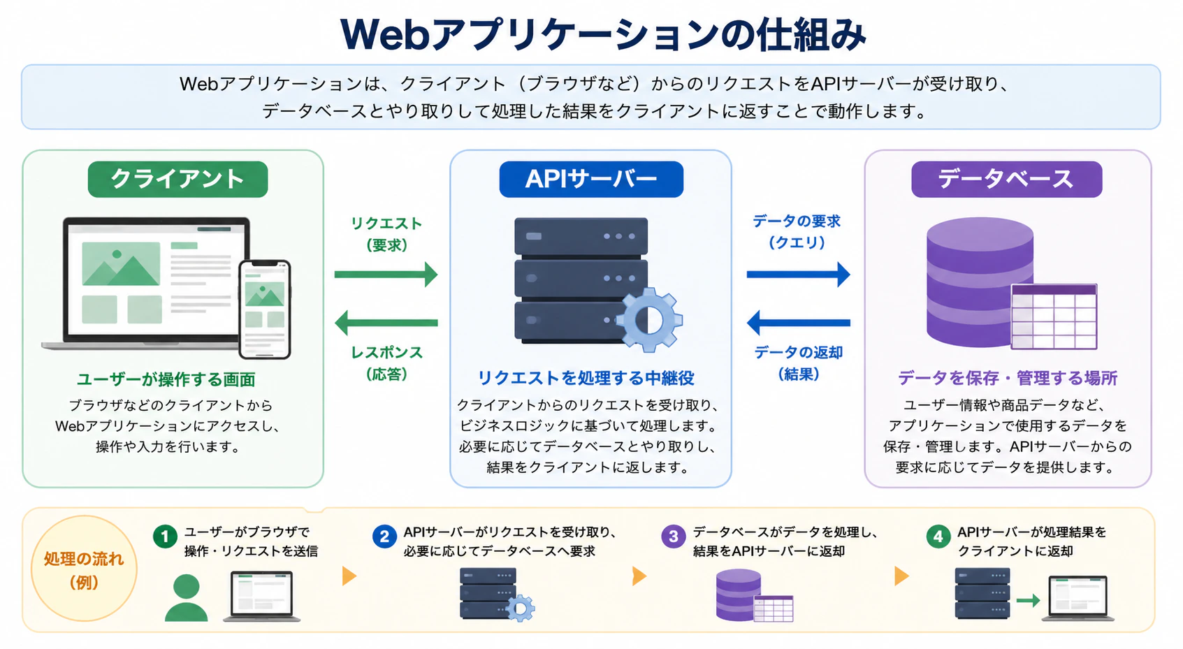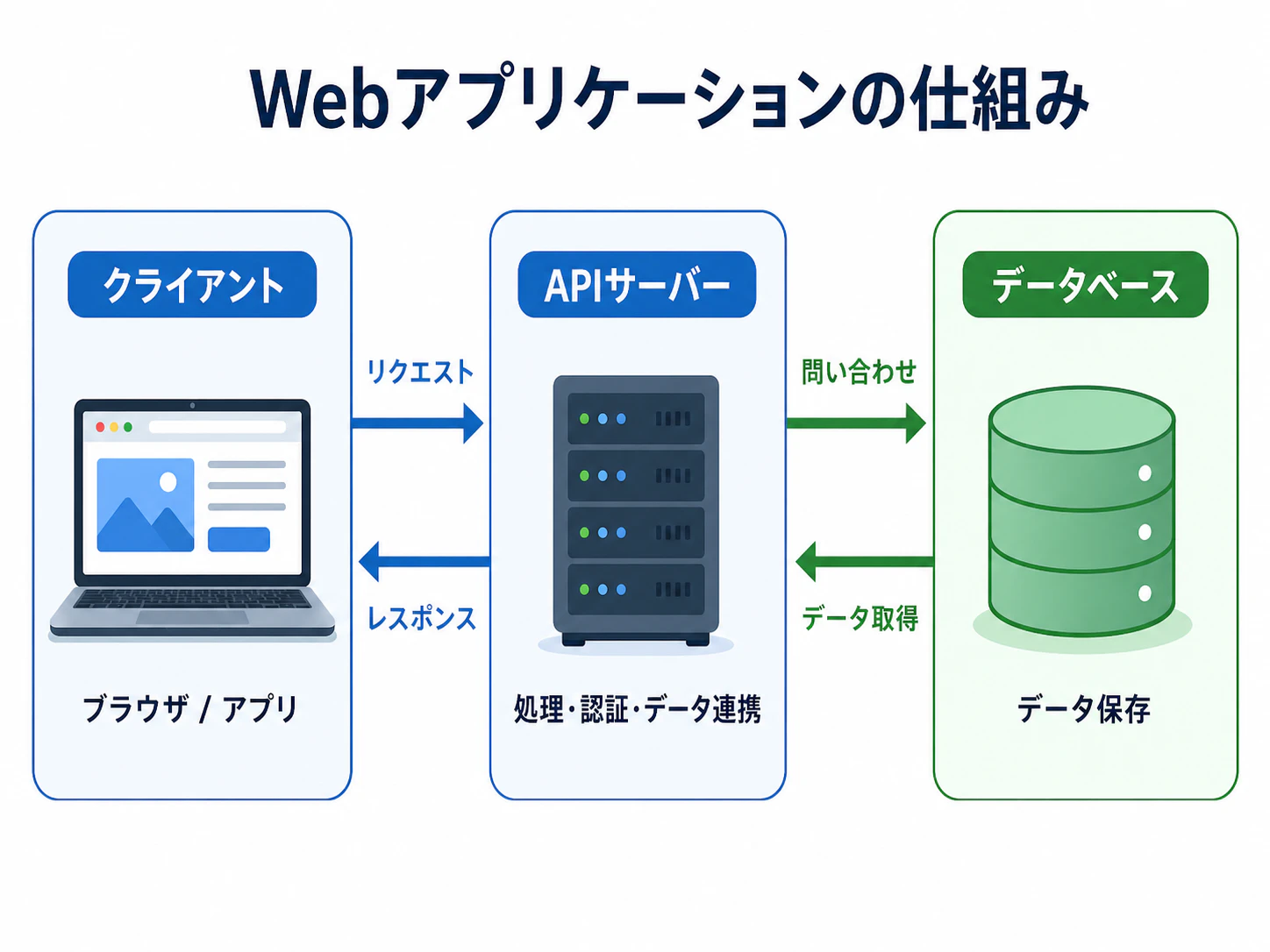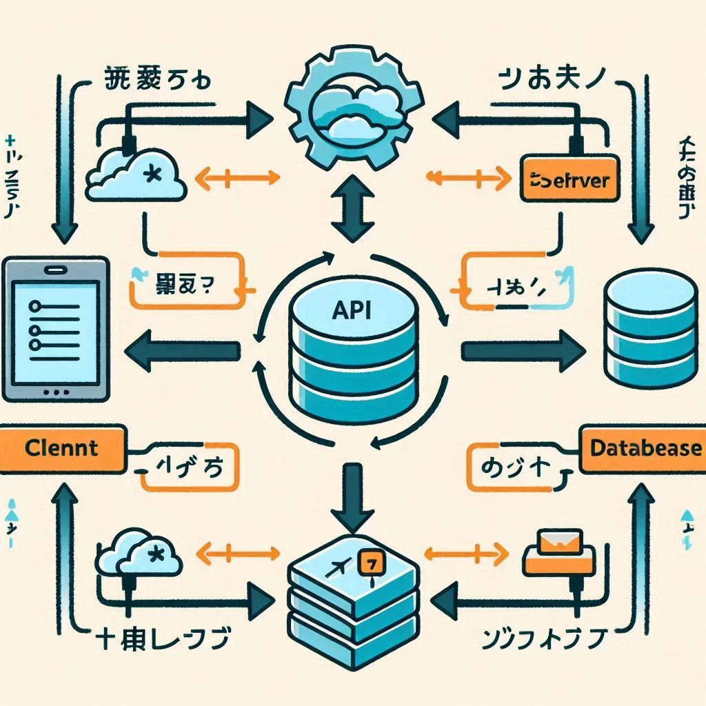 「Webアプリケーションの仕組みを説明するインフォグラフィック.左に『クライアント』,中央に『APIサーバー』,右に『データベース』を配置し,それぞれを双方向の矢印で繋いで.各要素に日本語ラベルを付けて.」