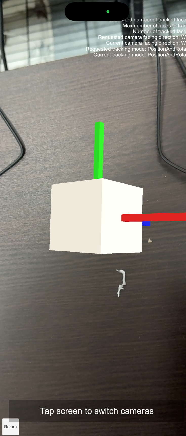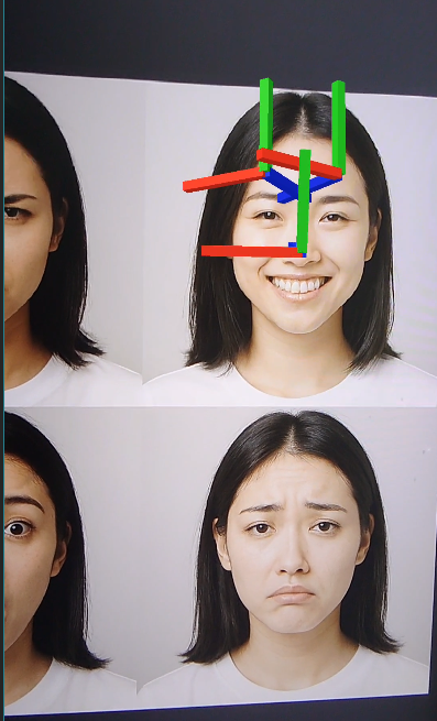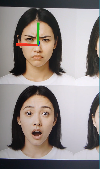 検出した顔の中央付近から、左方向、上方向、奥方向にそれぞれ赤、緑、青のオブジェクトを表示するサンプルです。