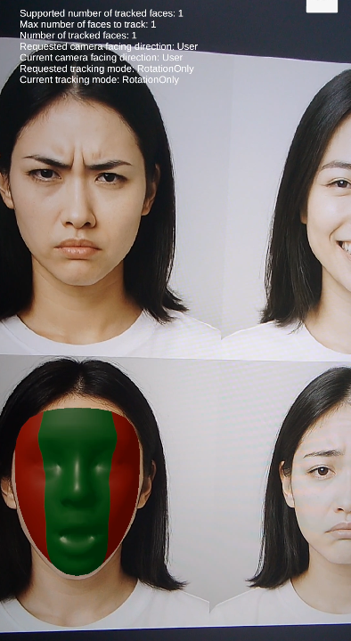 検出した顔にマスクをつけるサンプルです。同時に追跡可能な顔の数など、デバイスの対応状況も表示されます。