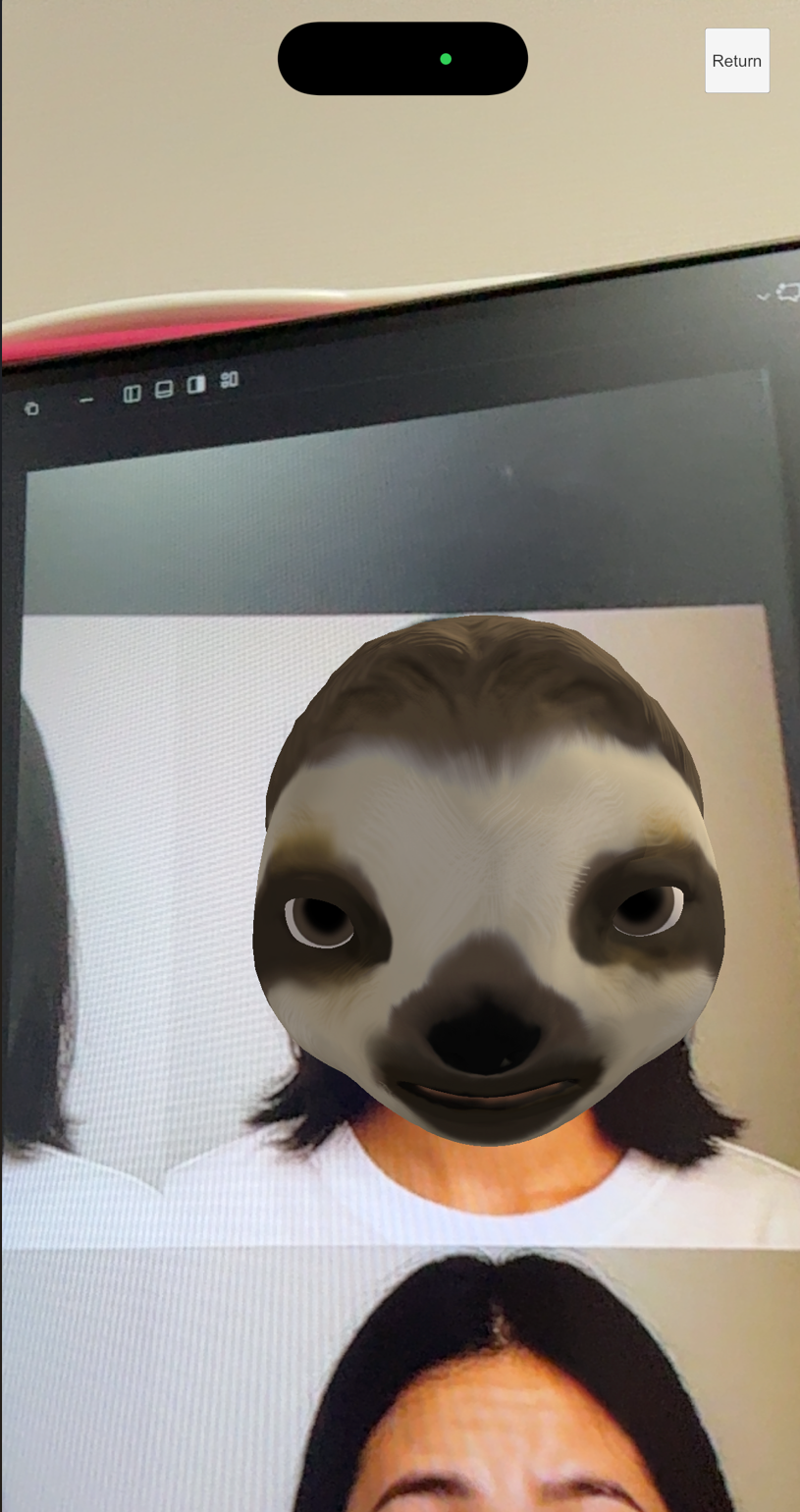 ARKit専用機能です。ウィンクや眉を顰めるといった表情(Blend Shapes)をブレンドするサンプルです。何かの哺乳類の顔で人の顔を上書きします。
