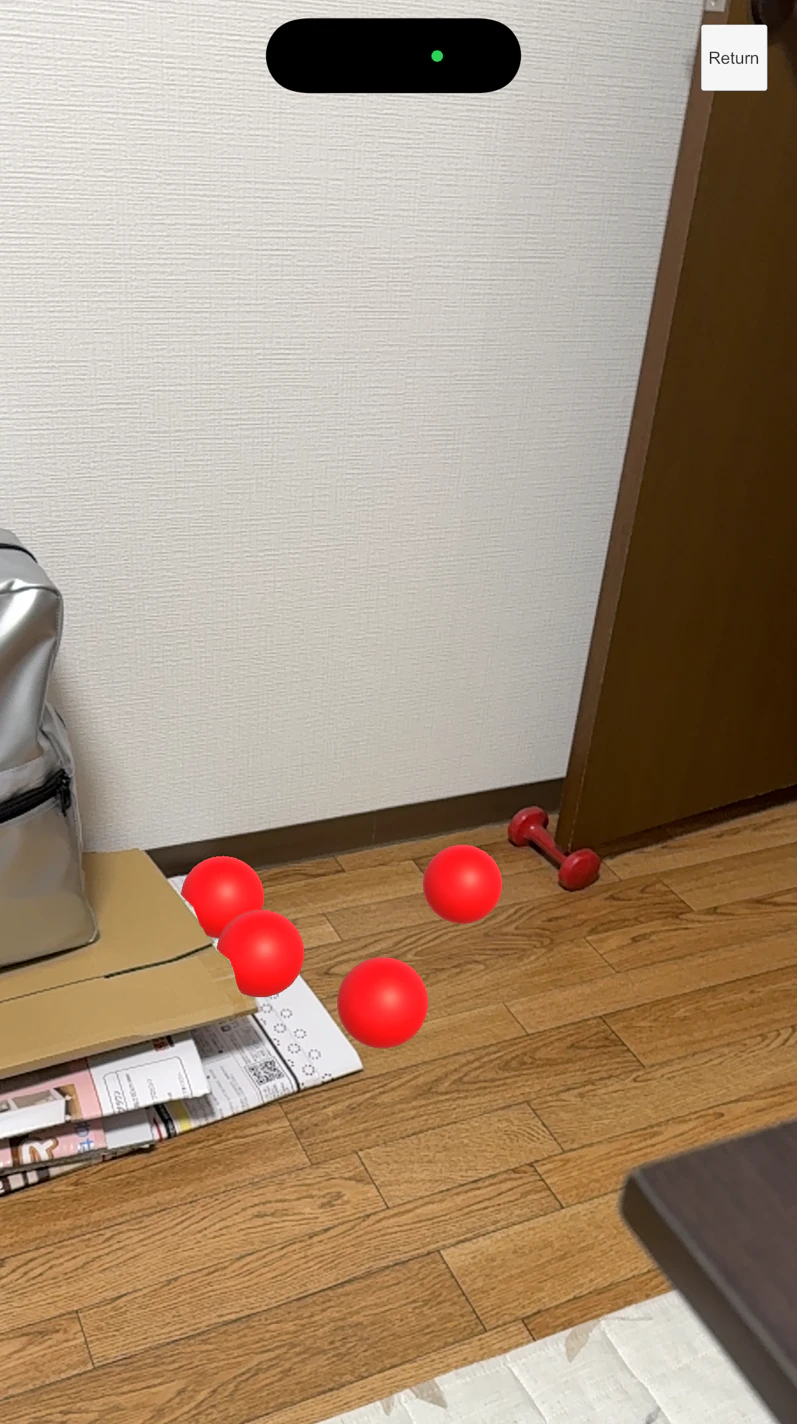 タップで赤いボールがスクリーン中央から飛ばされ、検出済みのメッシュに従って停止・オクルージョンがかかります。50個程度ボールを飛ばすとハングアップするので、サンプル内部に不具合があるかもしれません。