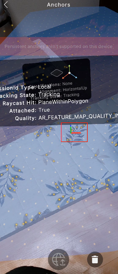 特徴点と検出平面の情報を表示しつつ、タップ位置にアンカーを作成するサンプルです。