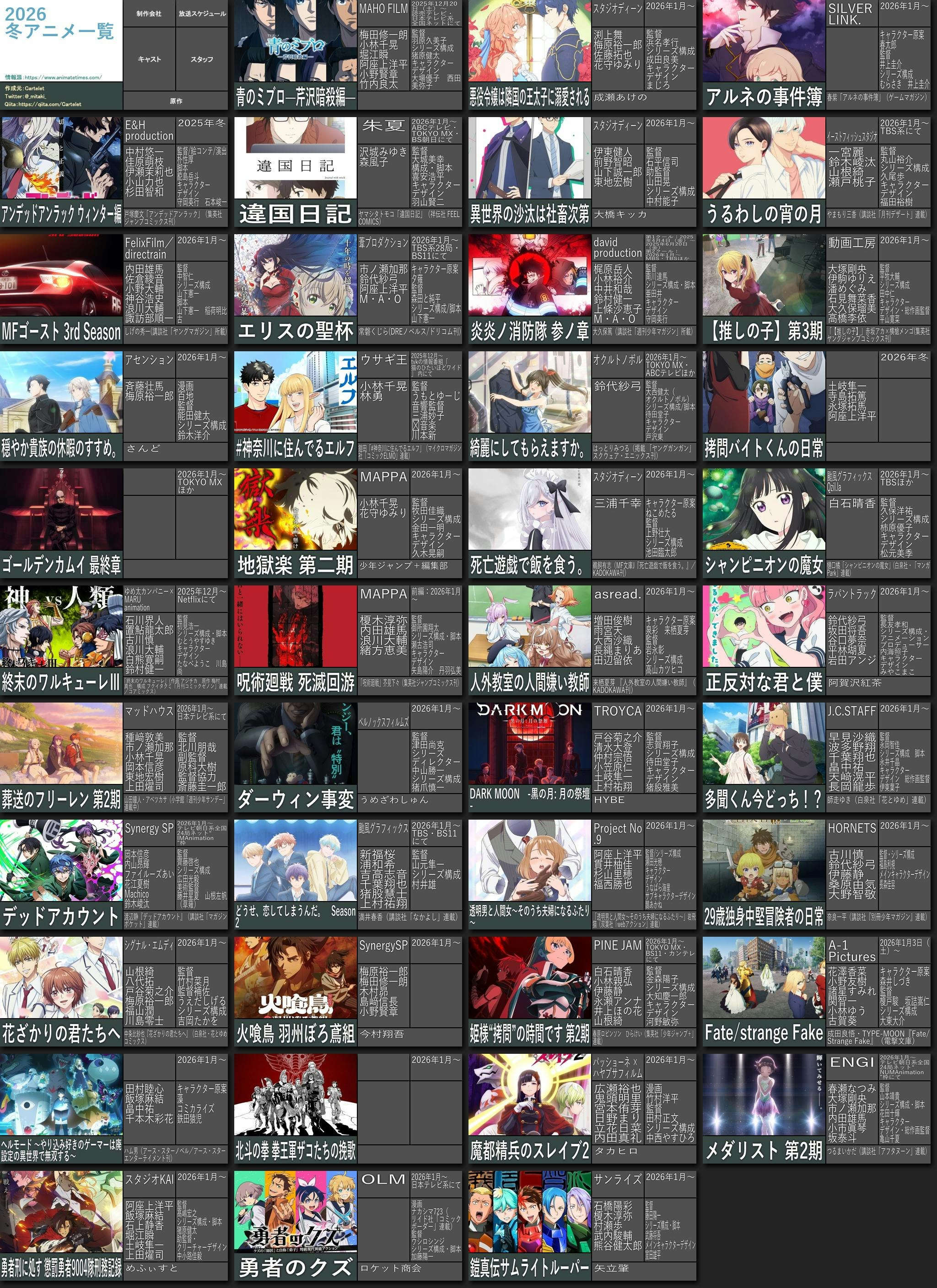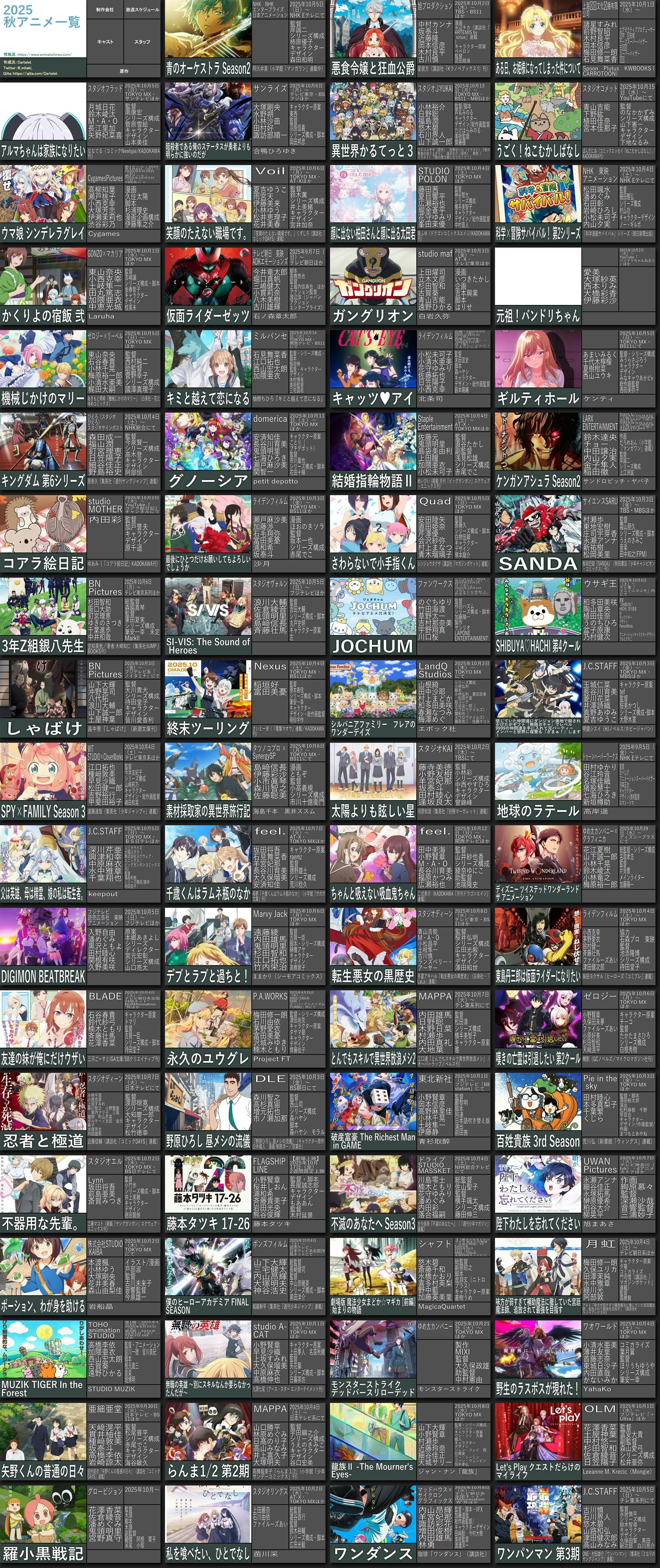 自分の手間はプログラムを実行するだけなので、忘れない限り、もしくは情報源のanimateTimesが一覧の更新を終了しない限りはこれから毎期更新したいと考えています(更新分はページ最上部にあります)。