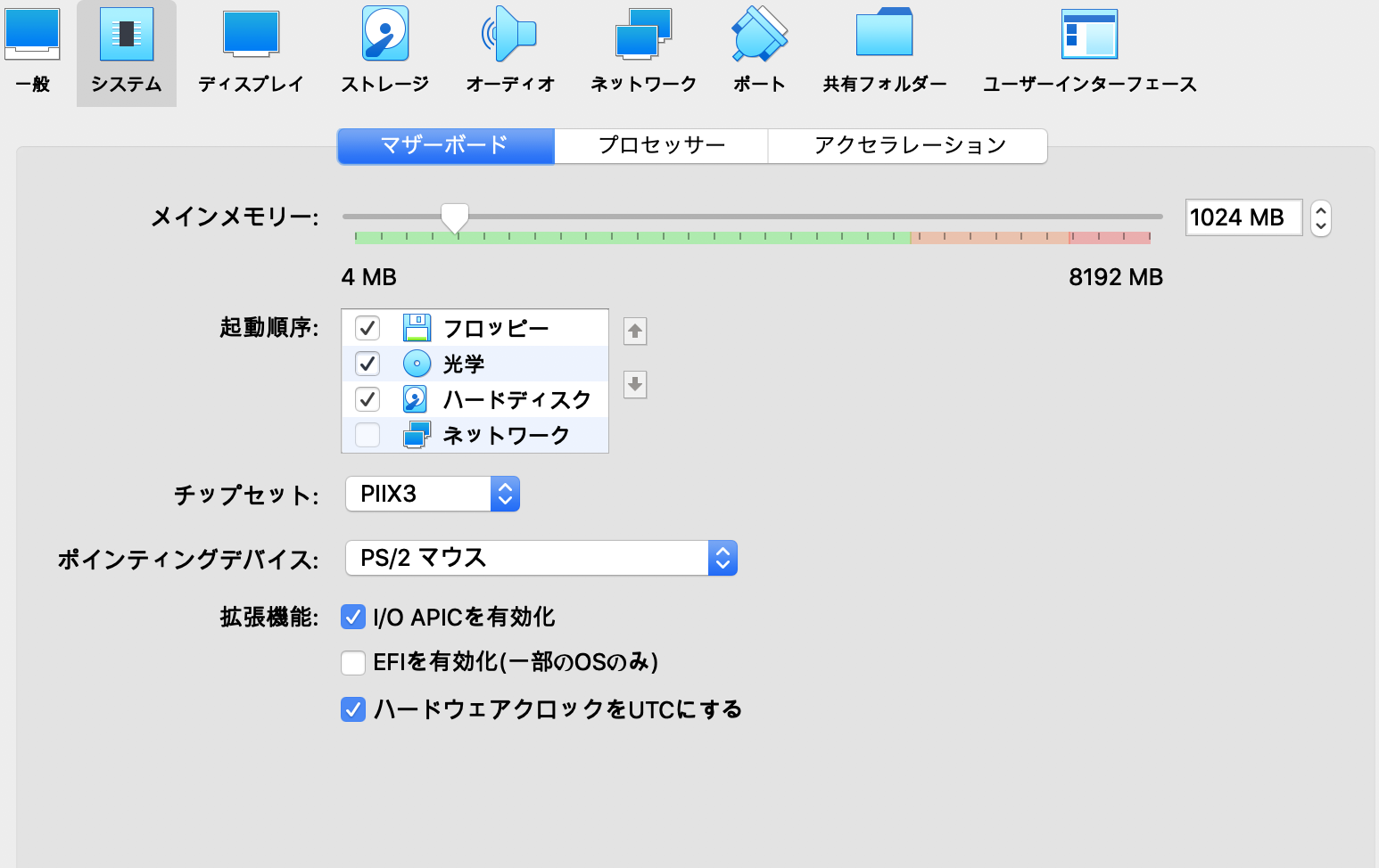 このエラーへの対応はVirtualBoxマネージャーの[設定]>[システム]で上記の画面に遷移し