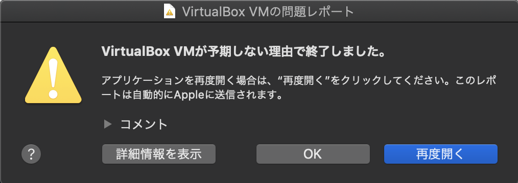 再度開くを選ぶとさらにエラー文が表示され、仮想マシンが全く起動できない
