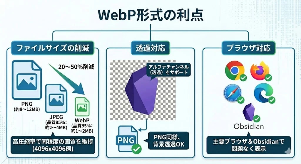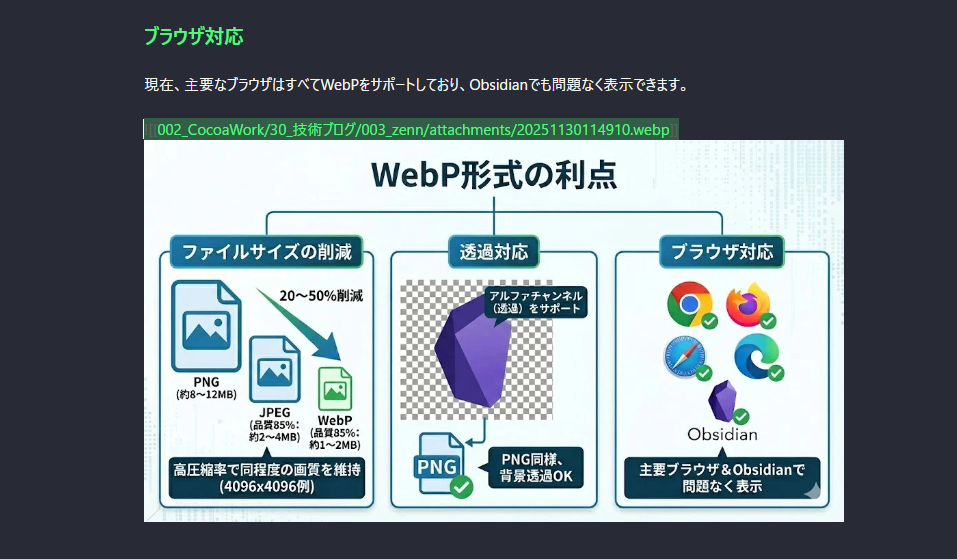 現在、主要なブラウザはすべてWebPをサポートしており、Obsidianでも問題なく表示できます。