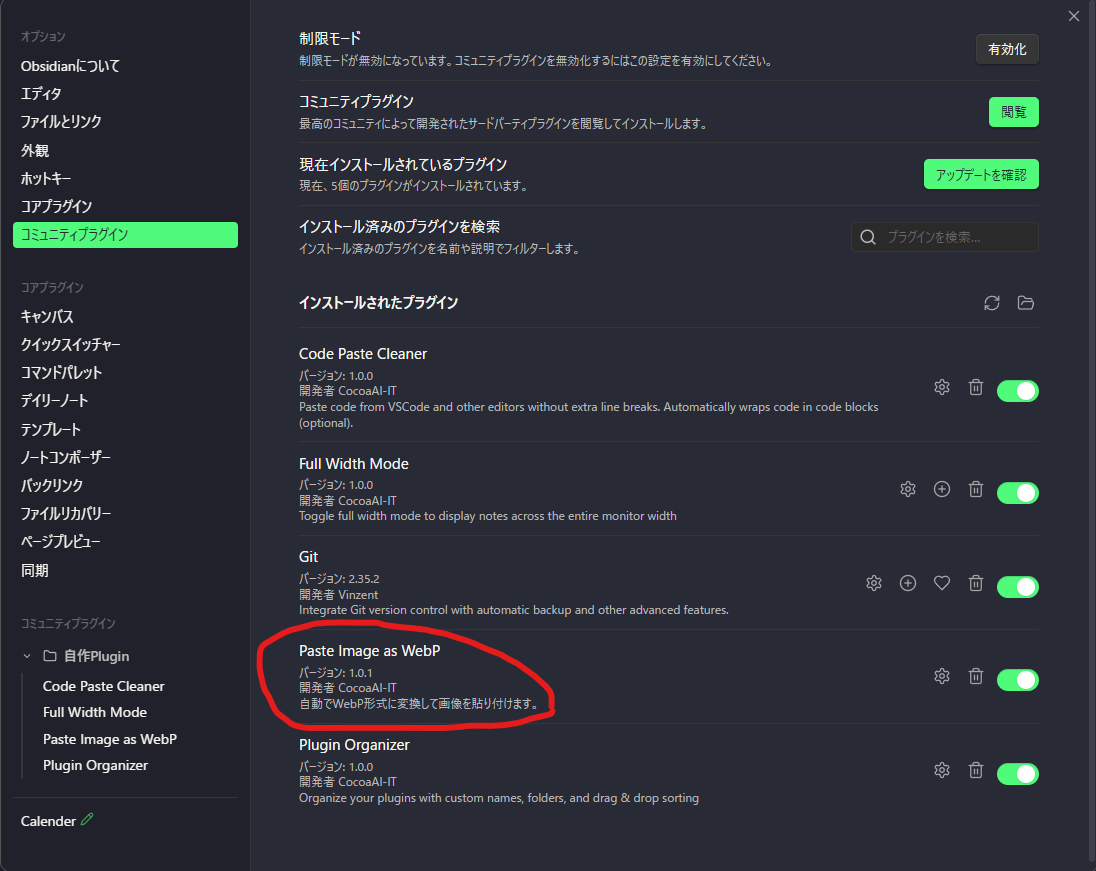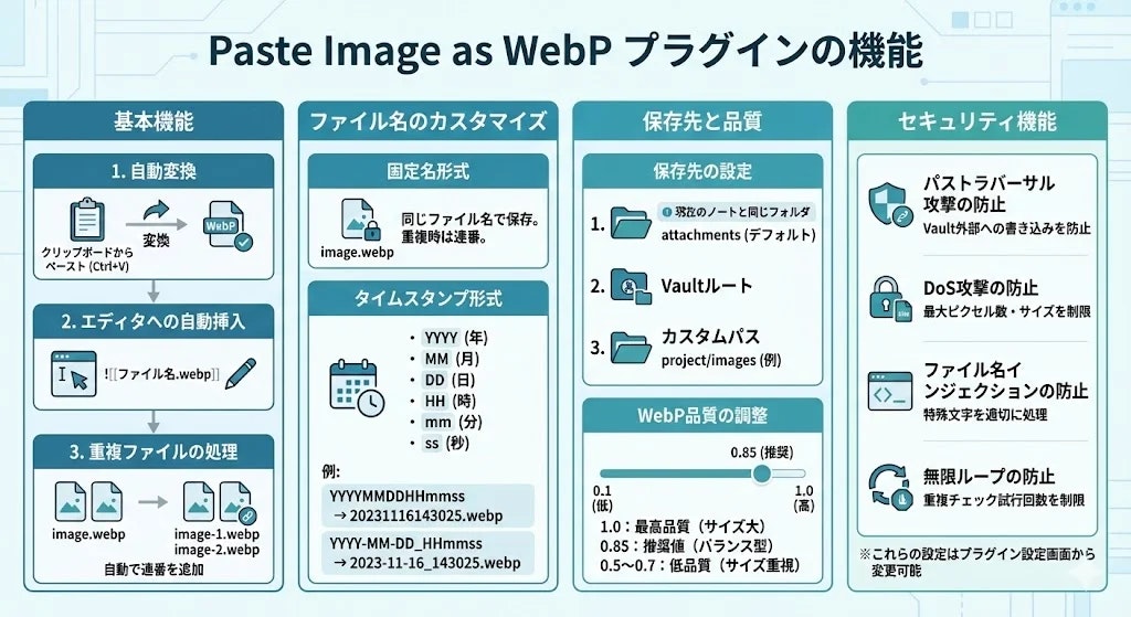 「Paste Image as WebP」プラグインは、以下の基本機能を提供します。