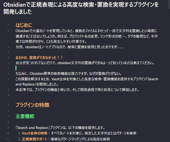 obsidianのデフォルト機能にもある標準的な行番号の表示を行う