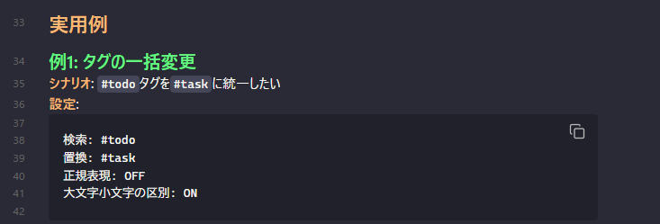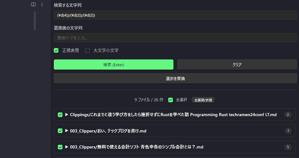 当然、obsidianはノートアプリなので、検索と置換をしようと思ったのですが、、、