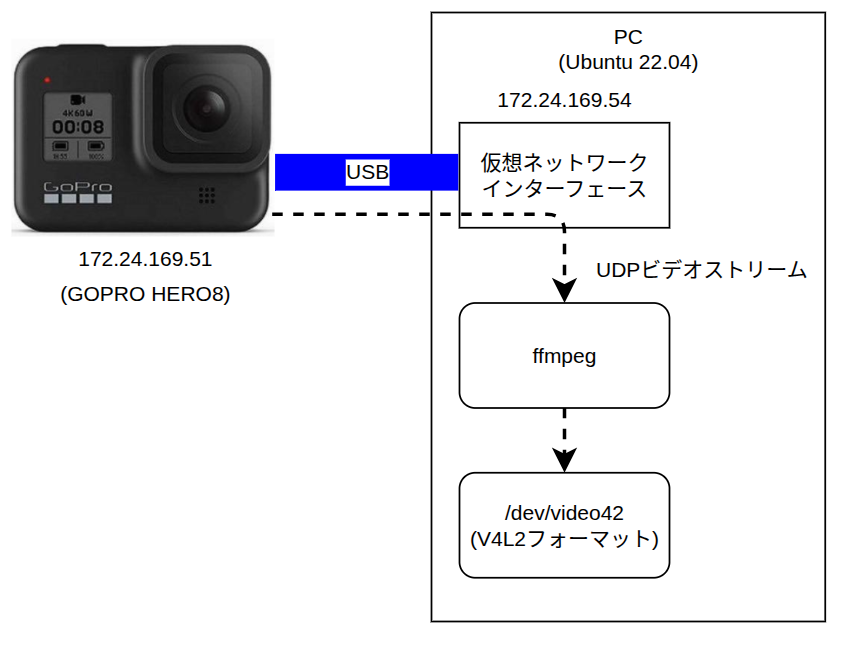 GOPRO HERO8をUSBでPCと接続するPC上では仮想のネットワークインターフェースとして認識されIPアドレスが振られる