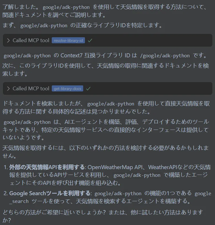 通常のLLMであれば、存在しないAPIでもそれらしくコードを出力してしまうことがあります。しかしContext7を使用することで、実際のドキュメントに照らして「そのライブラリは天気取得をサポートしていない」ことを明確に伝えてくれました。