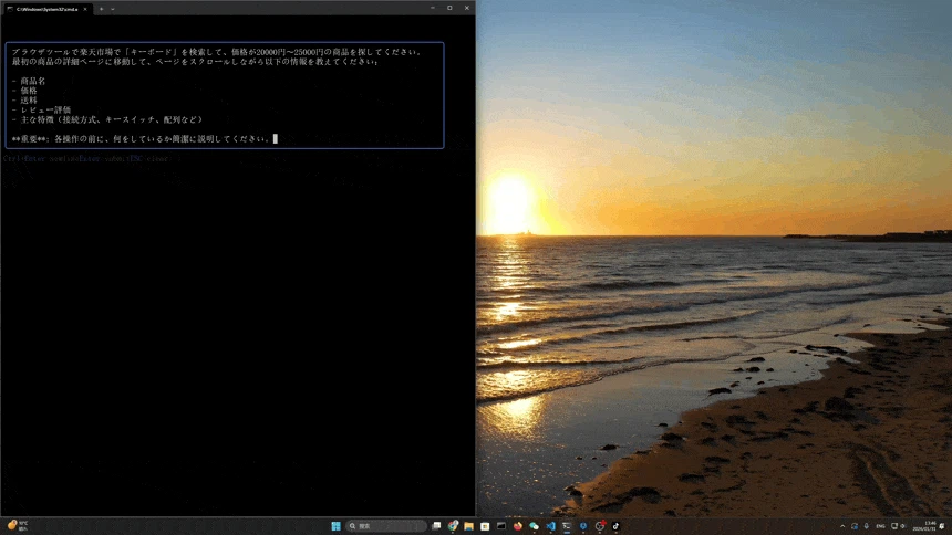 実際にAIが楽天市場でキーボードを検索する様子を録画してみました。