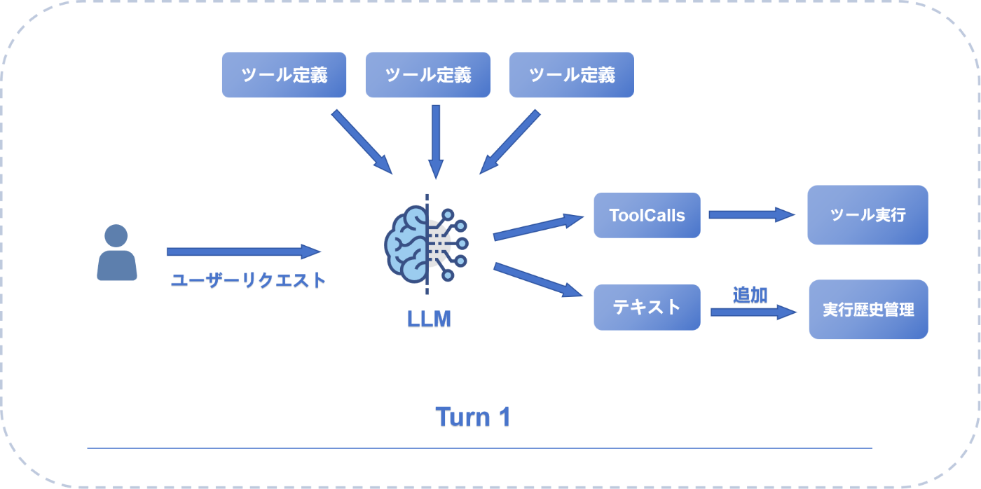 図から分かるように、単一のTurnでも実際には複雑な処理が行われています。ユーザーからのリクエストがLLMに送られると、利用可能なツール定義を参照しながら、2つの異なる出力経路に分岐します。