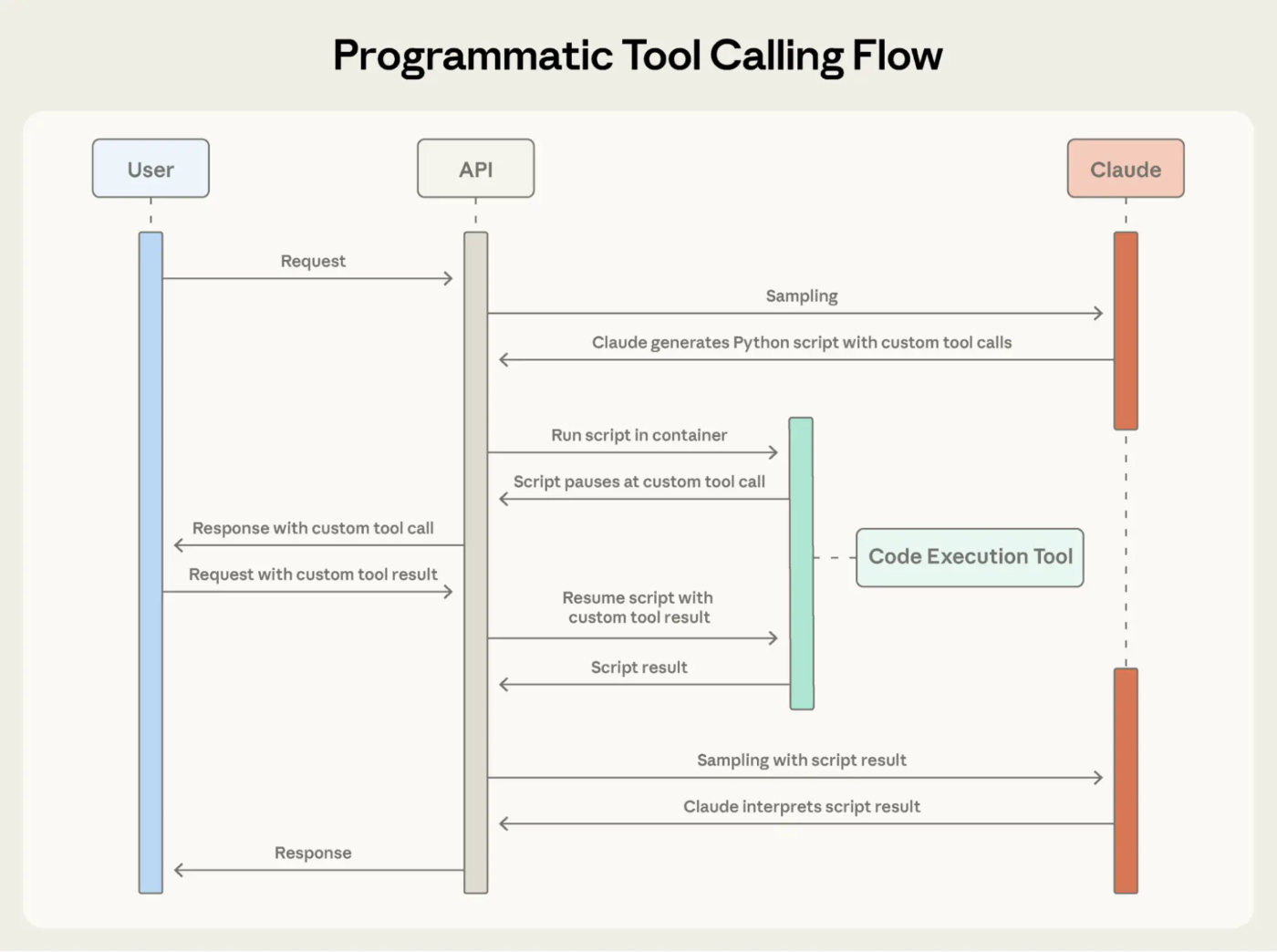 Claude が Python スクリプトを生成し、Code Execution Tool 内で実行される。スクリプトがカスタムツールを呼び出すと一時停止し、API 経由でユーザー側にリクエストが送られる。結果が返ると実行が再開され、最終的なスクリプト結果のみが Claude に返される。