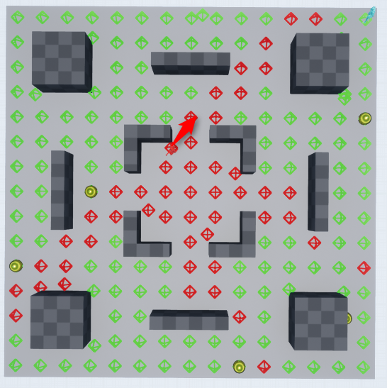 これも見えにくいのですが、床に緑やオレンジ、赤の球体のようなものがあります。これはInfluence Mapを可視化したもので、緑色は安全度が高く、赤色は安全度が低い、というのを表しています。