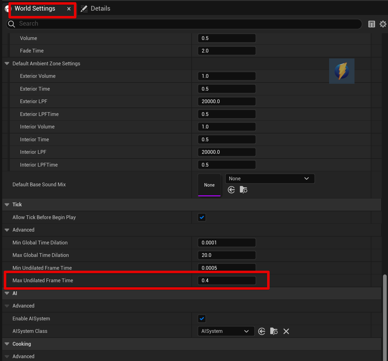 アンリアルエンジンは"Max Undilated Frame Time"としてアプリケーションが正しく動作するために最大で許容できるデルタタイムの上限値の設定がWorldSettingsの中にあります。