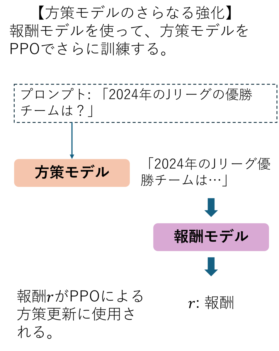 - 最近の研究では、LLMにRLHF(Reinforcement Learning from Human Feedback)が効果的といわれています。特にPPOを使用した一般的なRLHFは下の3つの図で説明できます。