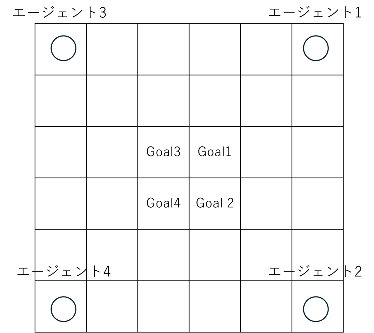マルチエージェント群を協調制御する際、対称性は一つカギになります。例えば、倉庫ロボットの自動制御を簡素化した下の図を考えたいとします。4つのエージェントがそれぞれのゴールを目指します。エージェント1の最適なルートは「↓↓→→」と動くことです。
