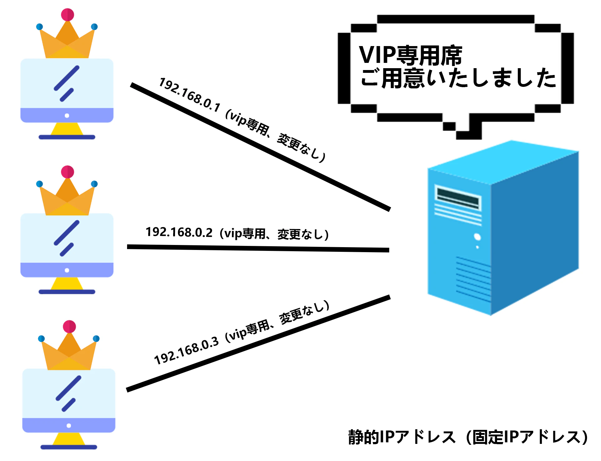 固定IPアドレスのため、端末数に応じて静的IPアドレスを配る必要がある。例えば、10台の機器をネットワークに接続する場合、10台分の静的IPアドレスを用意しなければならない。それに、静的IPアドレスの利用料はDHCPより高く、多人数の利用環境に向いていないと考えられる。通常はサーバ、個人PC、特定のコンピュータなどの機器・端末に利用されることが多い。