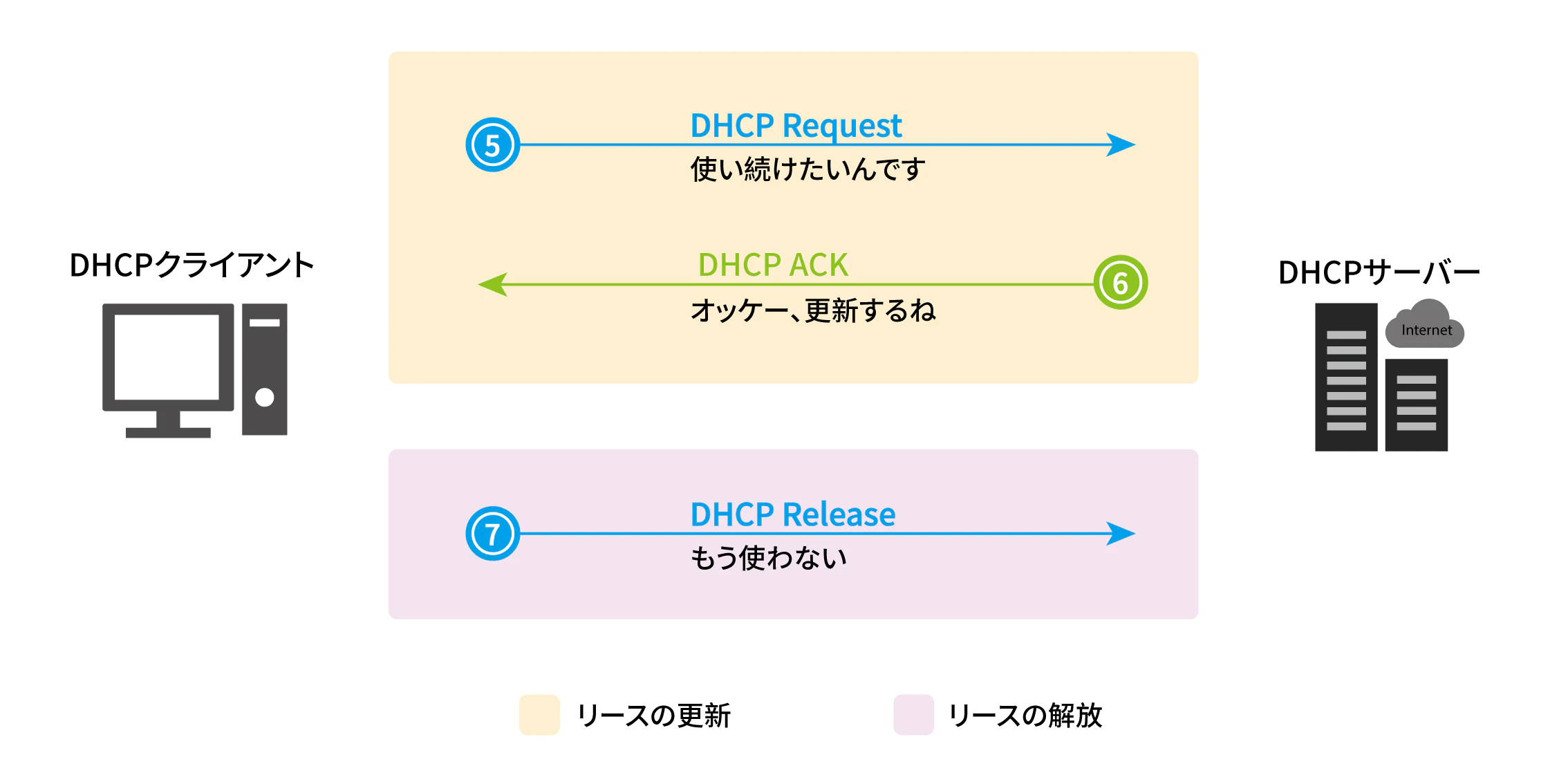 また、接続・通信の切断、電源を切る、IPアドレスが不要になるなどの場合、DHCPクライアントからDHCPサーバにDHCP Release(リースの解放)が送信されます。