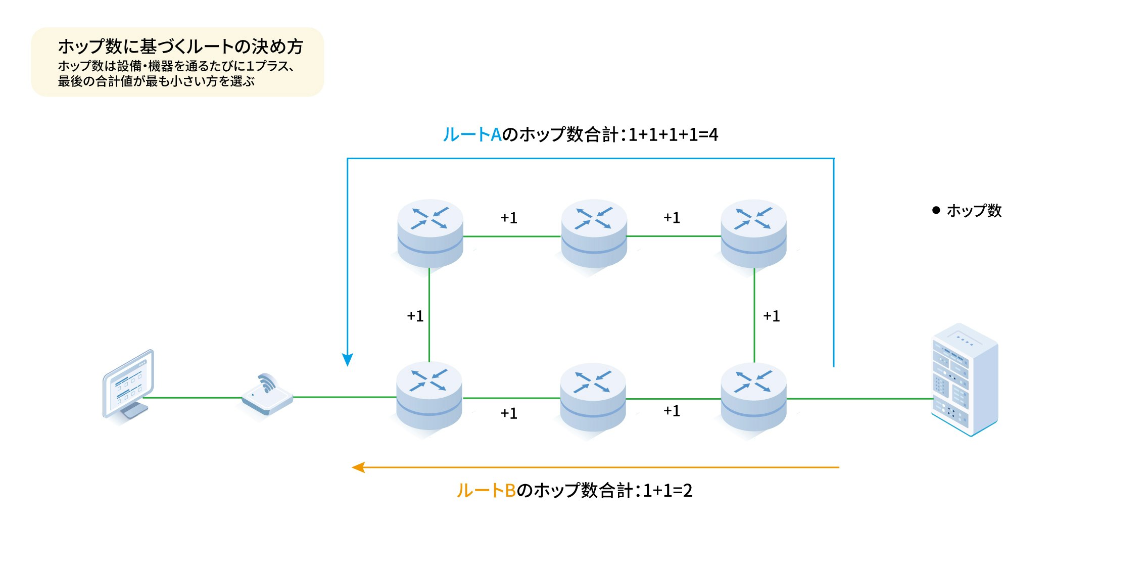 上記の図に示す通り、ルーターを通るたびにホップ数は「+1」加算され、ルーティングテーブルにもその数値が反映される。