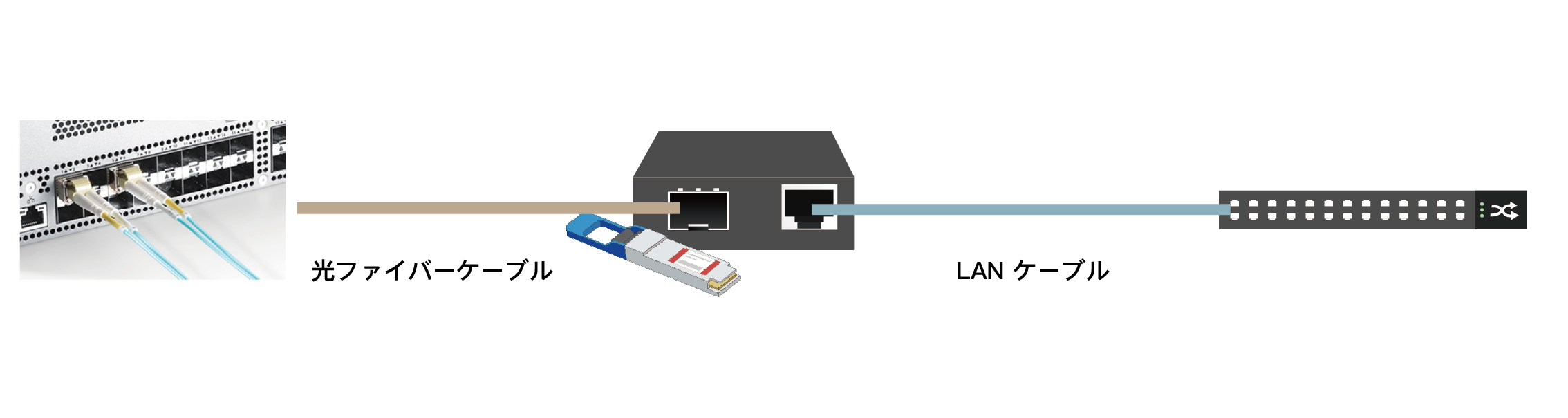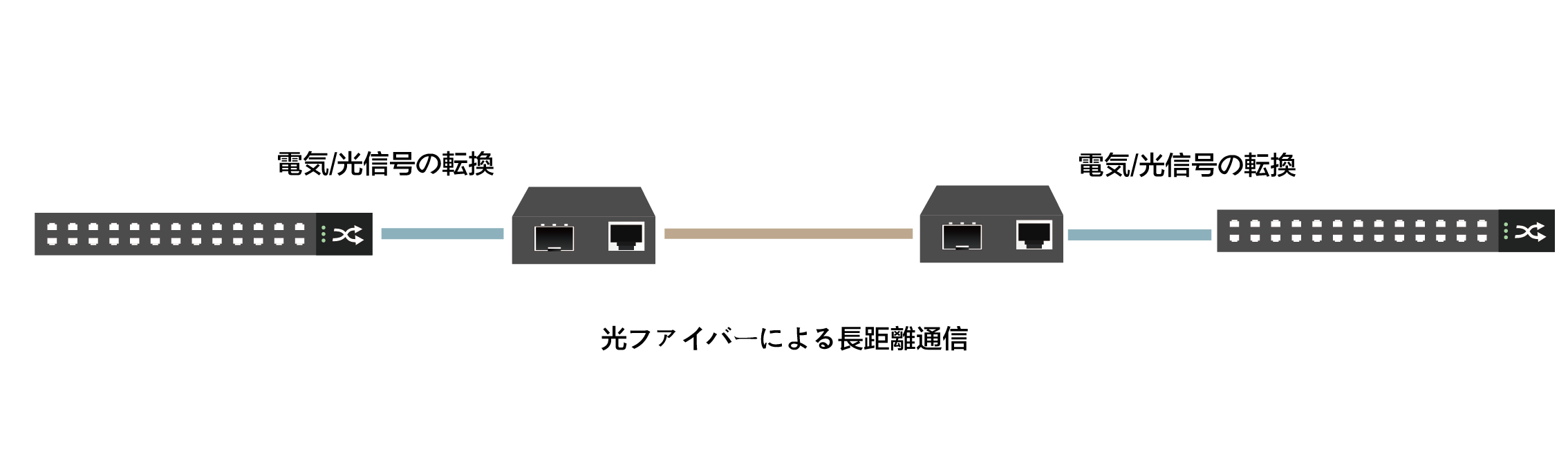 より長い通信距離を実現するために、メディアコンバーターもしくはスイッチングハブに接続し、光ファイバーケーブルによる長距離通信を使用します。