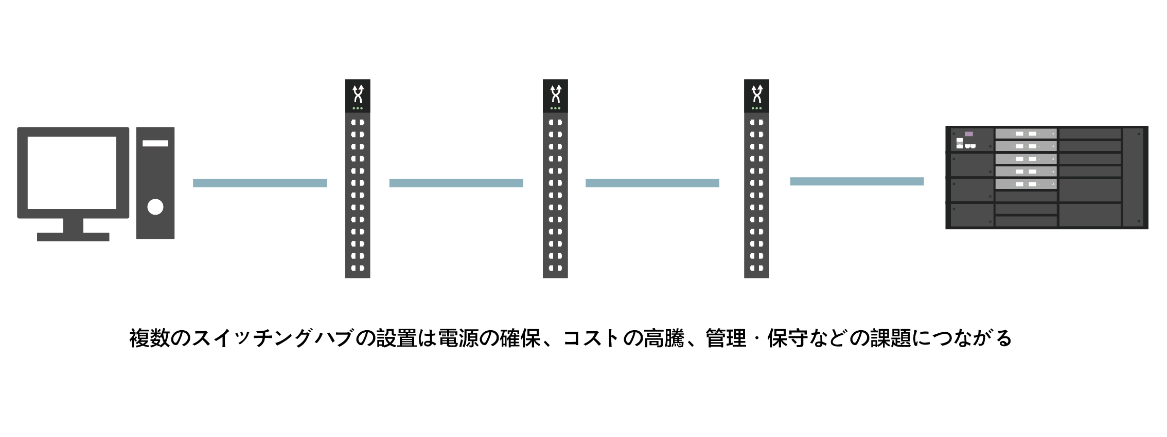 ただし、スイッチングハブを使用する際に、下記の図に示すように、障害時の復旧・対応が複雑で、管理・保守も面倒です。また、長距離通信を確保するために、スイッチングハブごとに電源を用意しなければなりません。