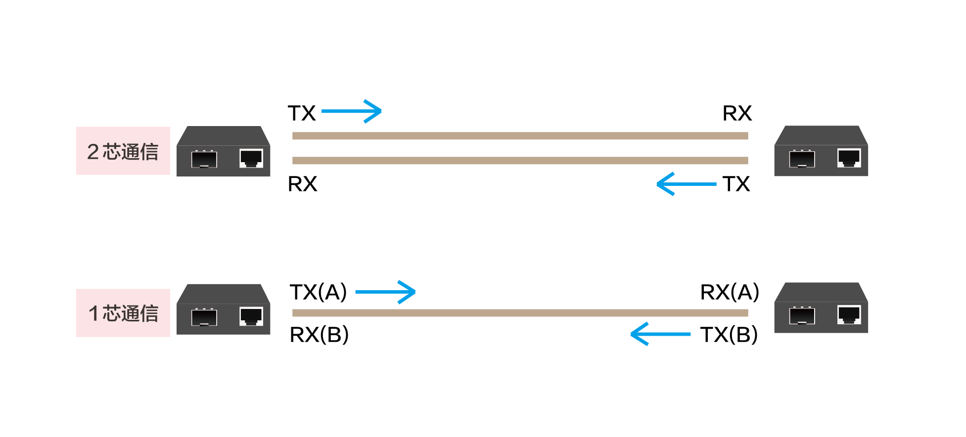 2芯通信:2本の光ファイバーはそれぞれ受信と送信を担い、機器内部の構造がシンプル。