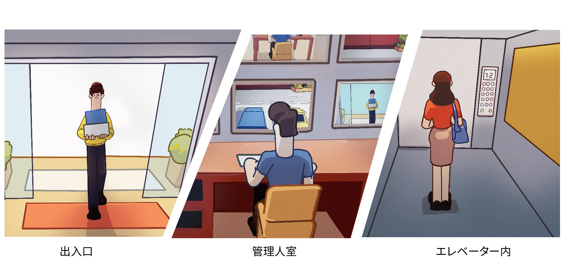 他の施設とは違い、多人数の集合場所であるマンション・寮では、人の流れや動きが把握にくいし、駐車場、エレベーター、非常用避難口などの付属施設に対する監視も義務づけられます。