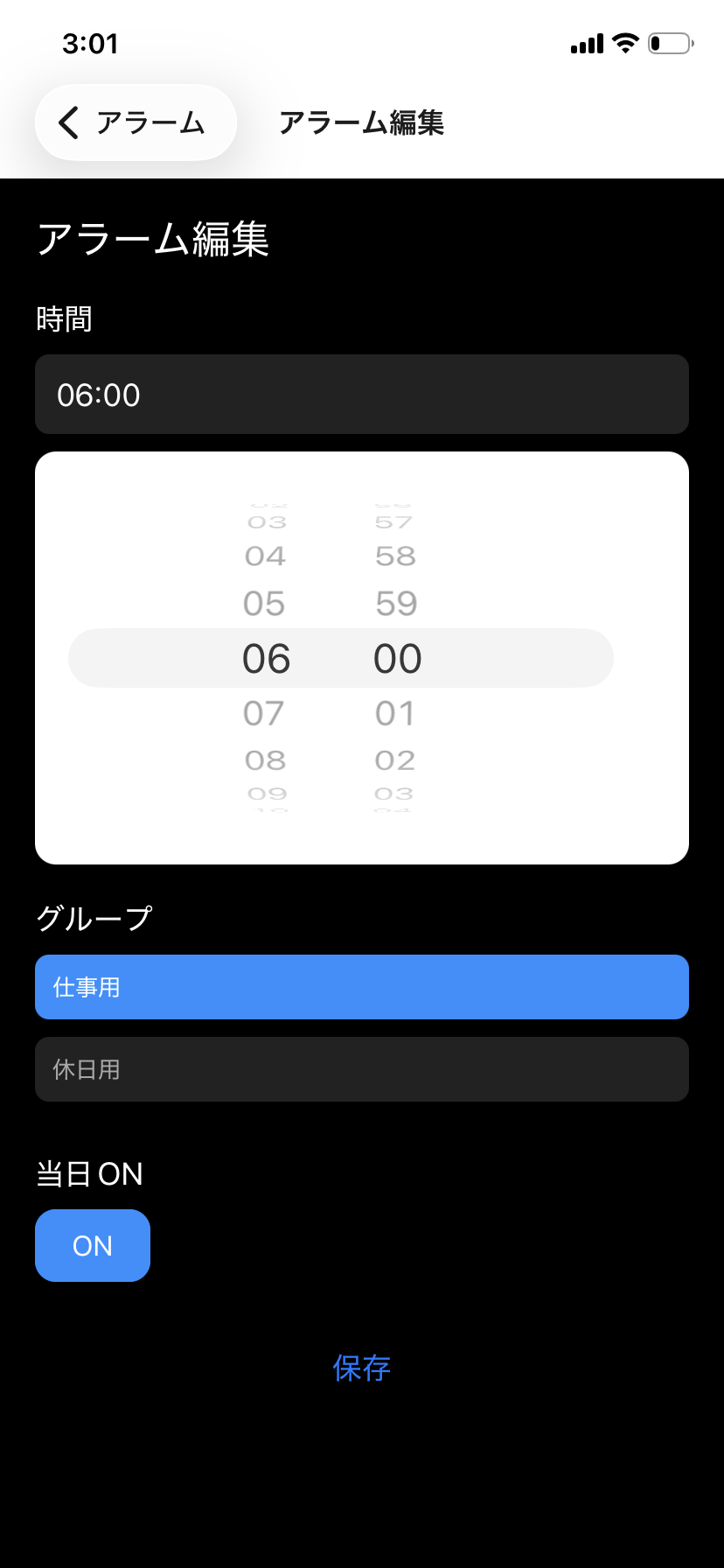 アラームの詳細設定画面で、時刻、曜日、当日 ON/OFF などの設定を行います。