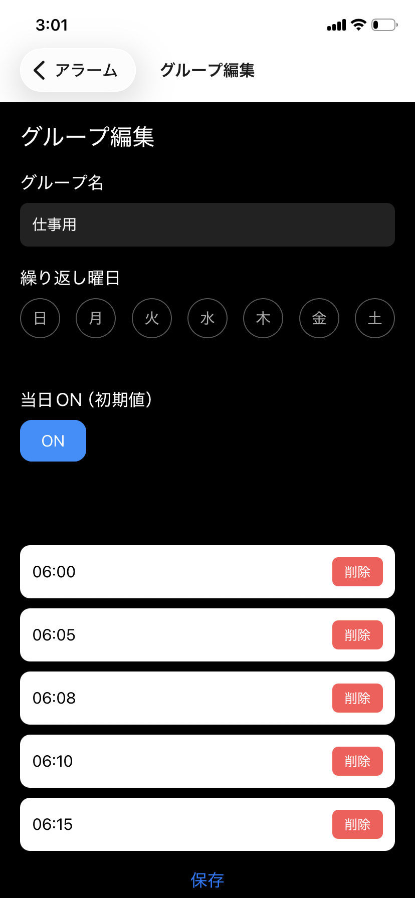 アラームグループの編集画面で、グループ名の変更やアラームの追加・削除を行います。