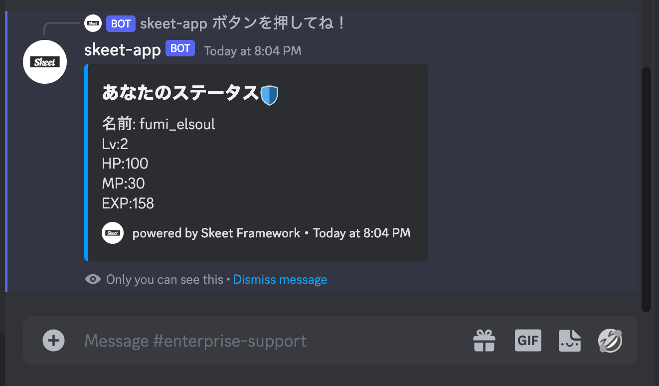 description: `名前: ${user.username}\nLv:${user.lv}\nHP:${user.hp}\nMP:${user.mp}\nEXP:${user.exp}`,
