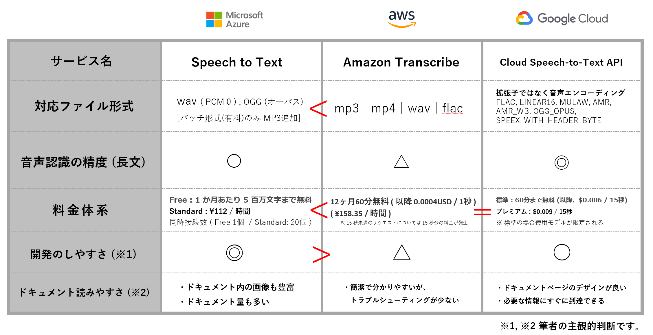 ※また、本記事では、3大クラウドプラットフォーム ( Azure / AWS / GCP ) の Speech To Text サービスの性能を比較し、ランク付けをさせていただいておりますが、使用する音声の録音環境、録音デバイス、その他環境の差により、当記事の検証結果と異なる場合がございますので、使用用途に応じて各自ご自身の判断で活用するサービスの選定を行うようにしてください。