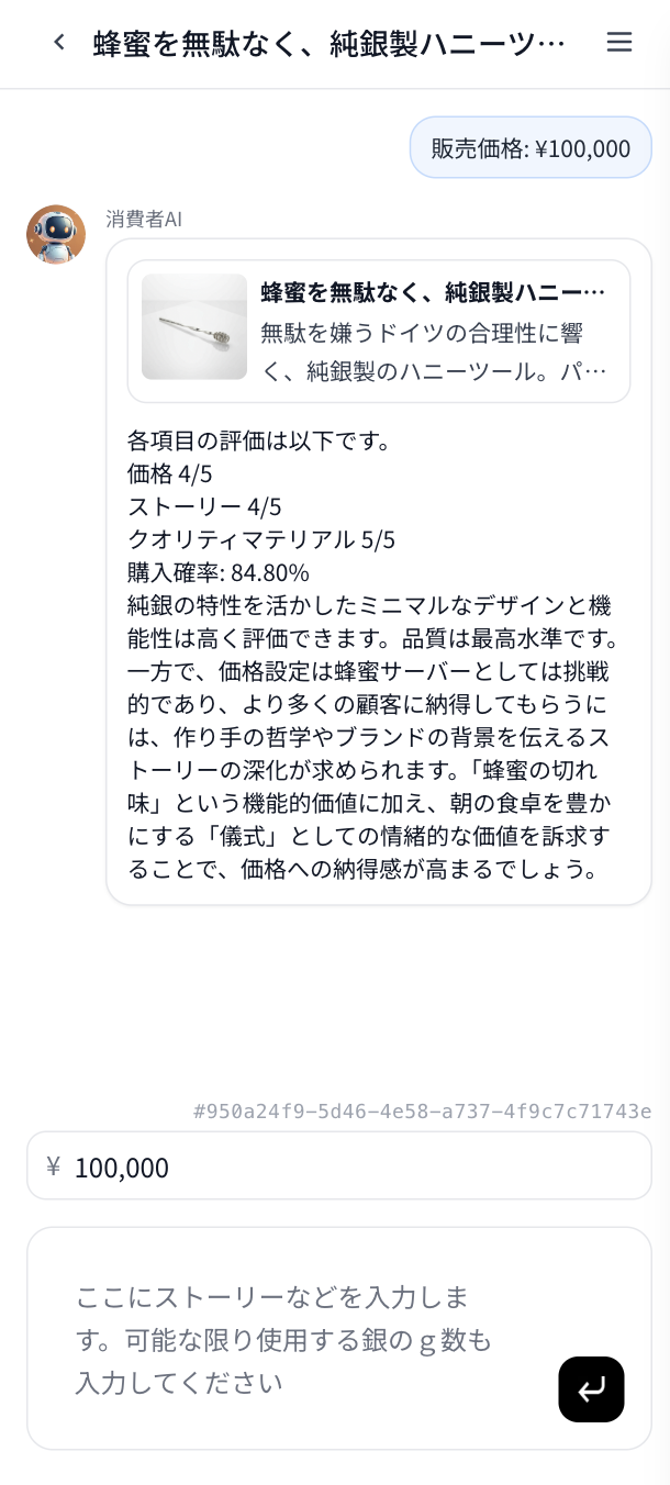 今回の主役は「海外消費者AI」機能。AIが生成した商品のデザインや価格について、「海外の富裕層から見てどう映るか?」を評価し、具体的なフィードバックと国別の購入確率を算出します。