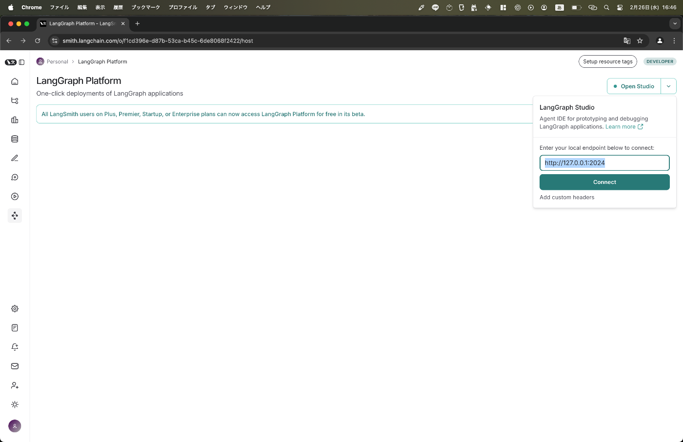 起動したサーバーに対して、LangGraph Studioからアクセスします。