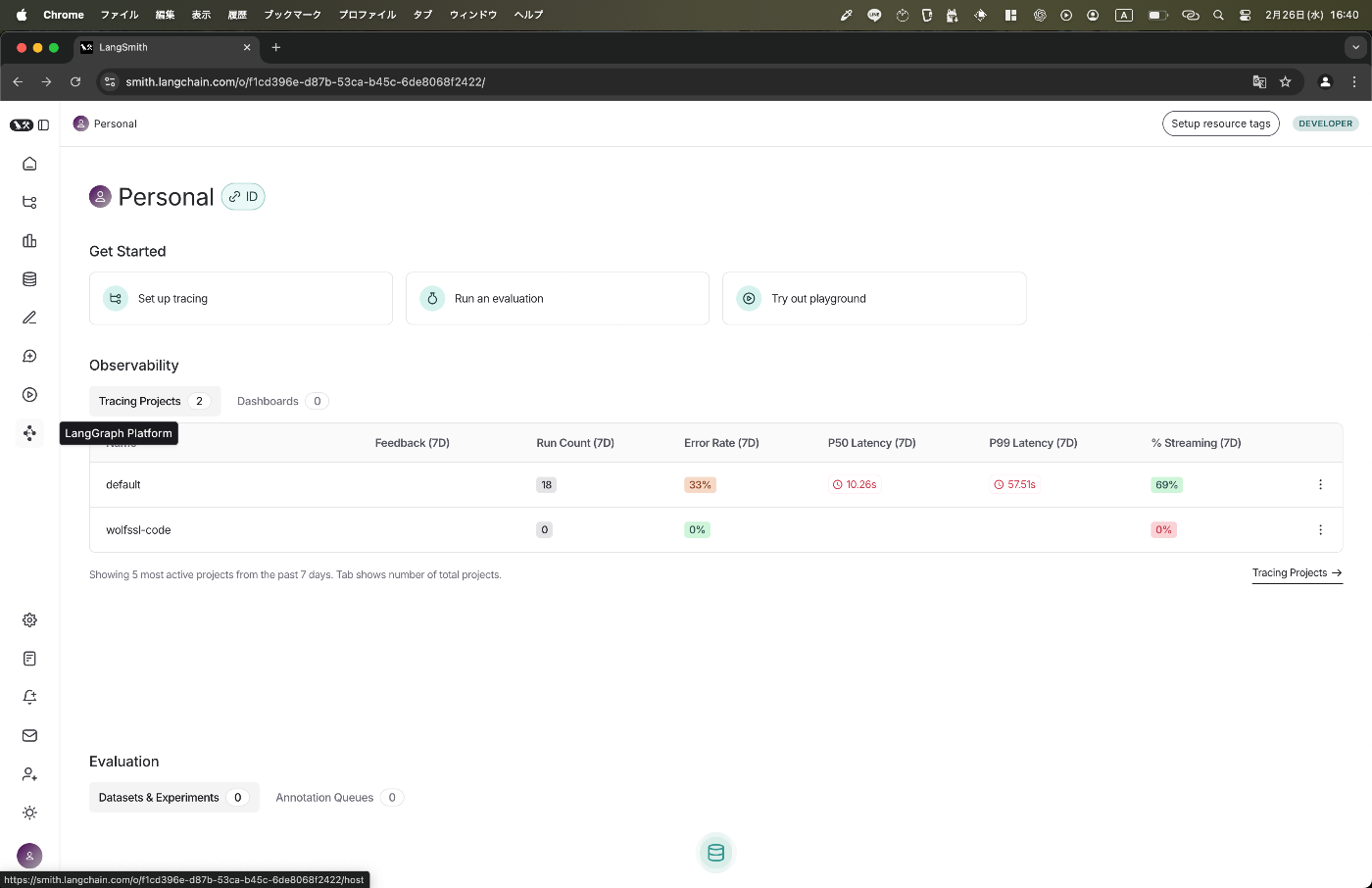 ChromeじゃないとStudioが正常に動かなったのでChromeからLangSmithにアクセスしましょう。