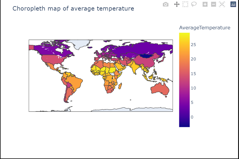 fig=px.choropleth(avg_temp,locations='Country',locationmode='country names',color='AverageTemperature')