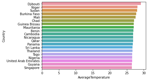 sns.barplot(x=avg_temp.sort_values(by='AverageTemperature',ascending=False)['AverageTemperature'][0:20],y=avg_temp.sort_values(by='AverageTemperature',ascending=False)['Country'][0:20])<AxesSubplot:xlabel='AverageTemperature', ylabel='Country'>