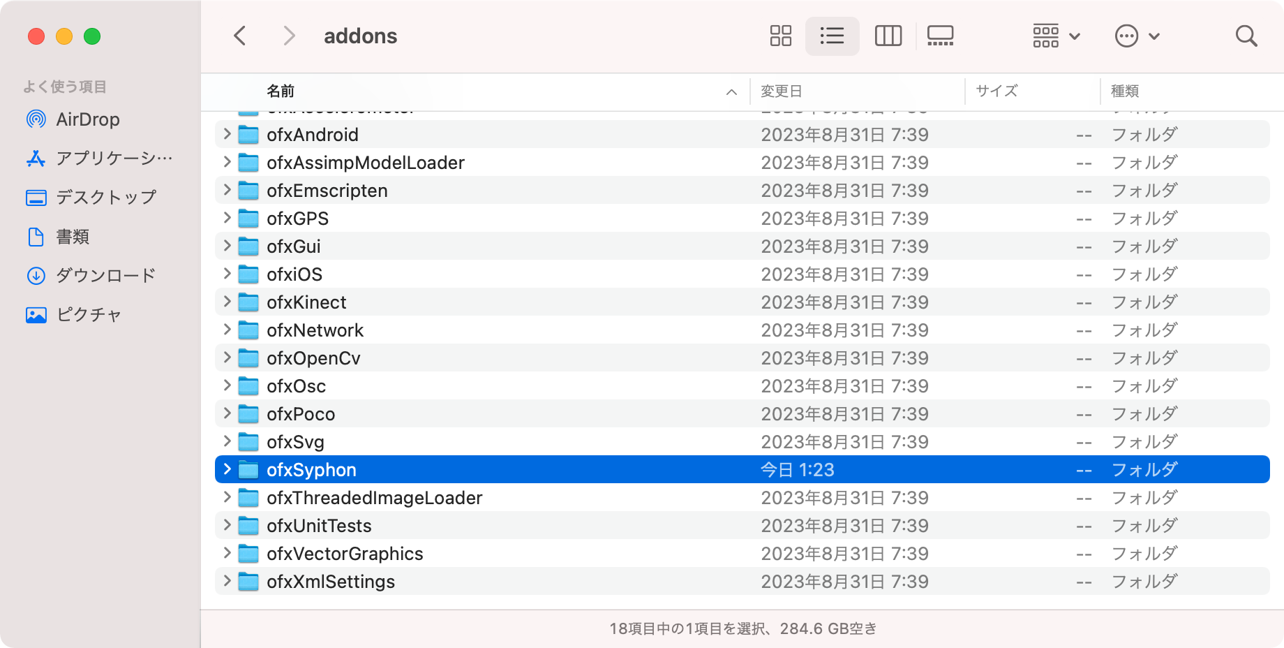 ダウンロードしたofxSyphonはopenFrameworks/addonsフォルダ配下に格納する