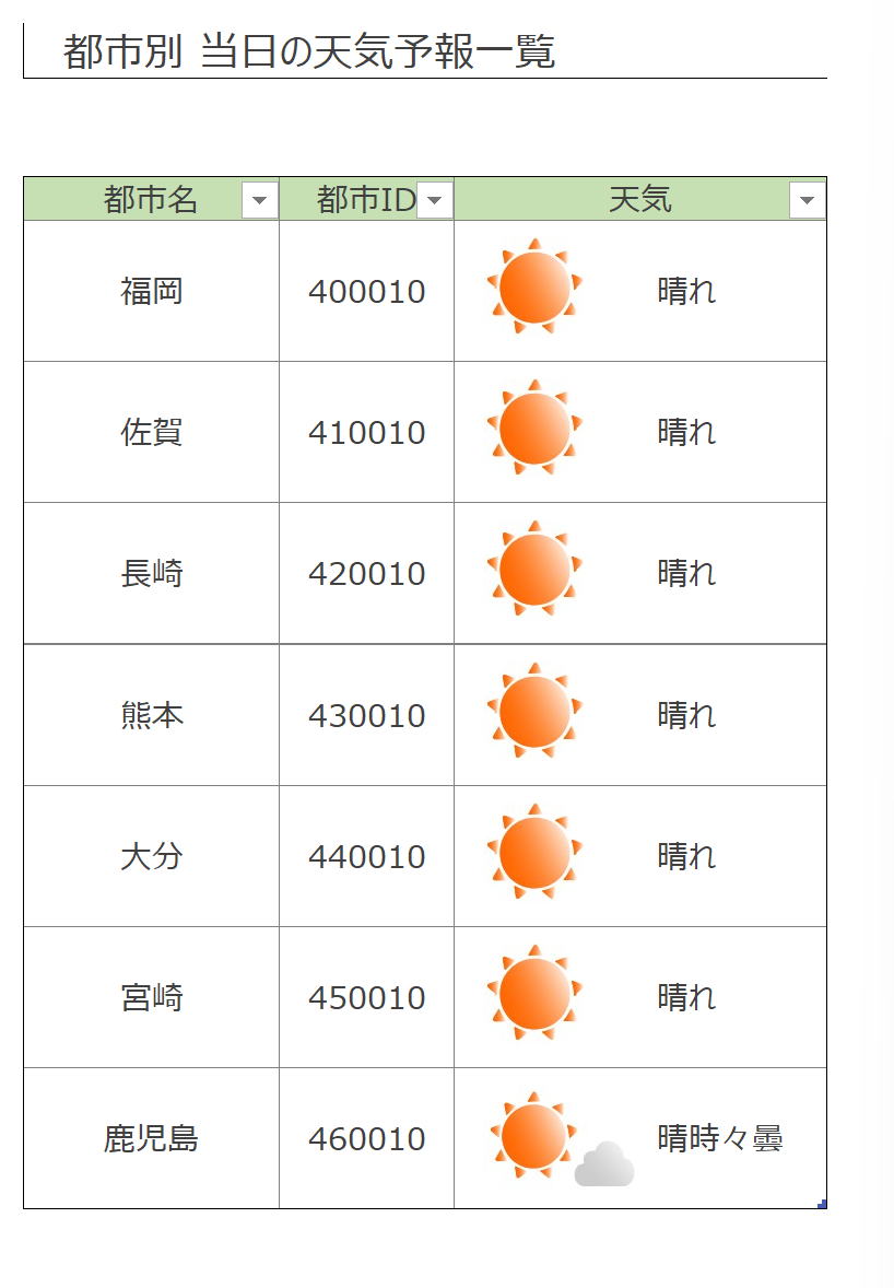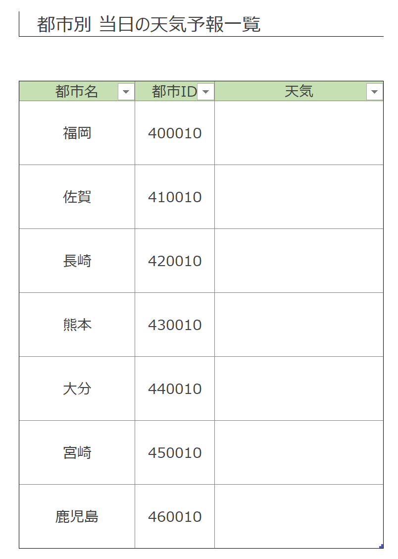 - 都市名、都市IDは「都市別天気予報」シートのテーブル上に予め記載しておく