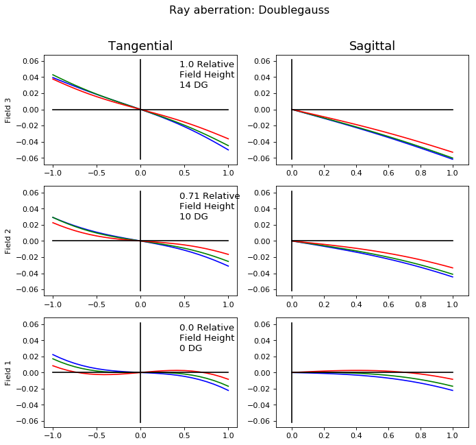 次に示すのが、opticspyのレイトレーシングモジュールを使用して最大視野角20度のF/5トリプレット3を構築する例です。レンズ系のスポットダイアグラムと収差図が表示されます。 - 表面、波長、フィールドを追加することにより、レンズ系を構築する。