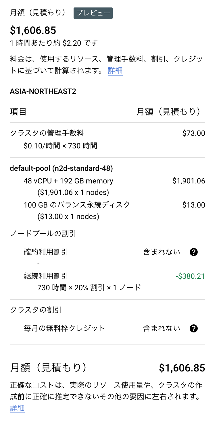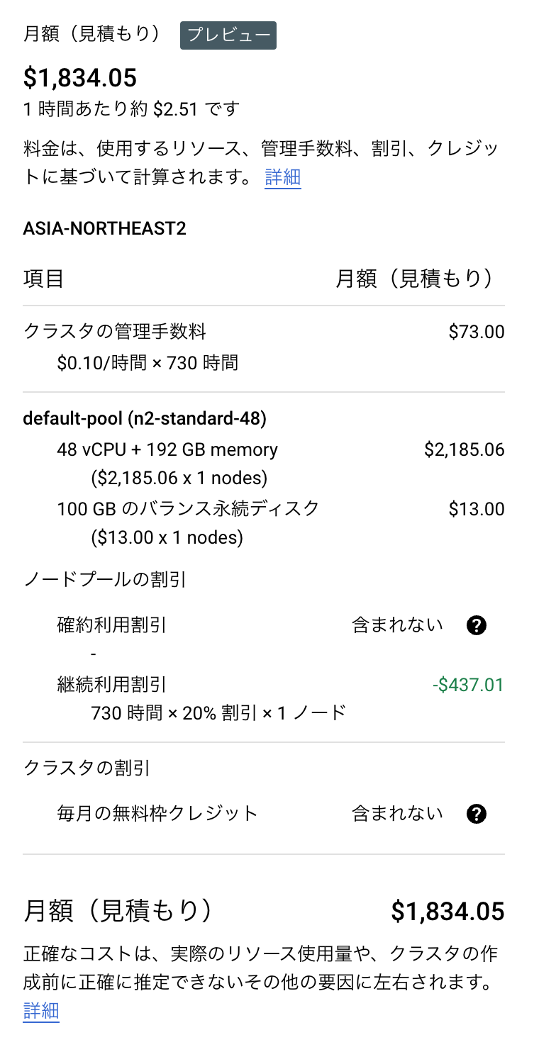 まず、N2インスタンス(n2-standard-48)で1ヶ月使うと$1,834.05かかります。