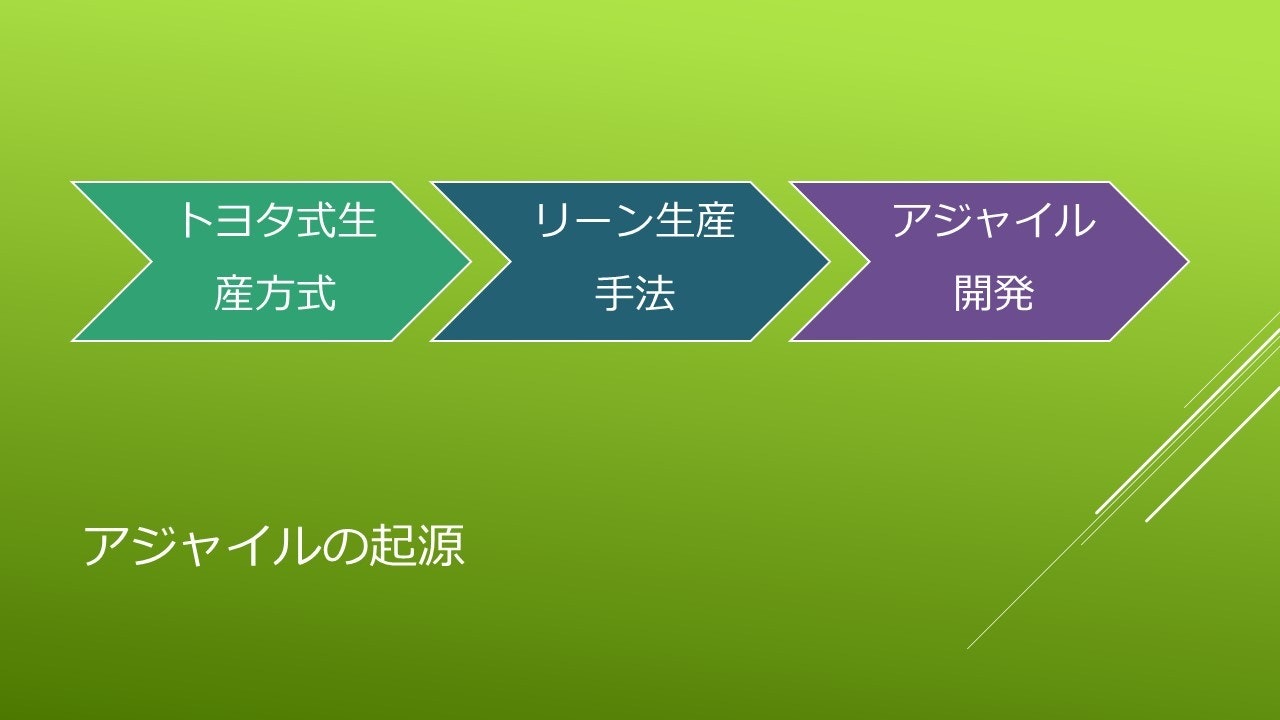 ですが、実はアジャイルの起源は日本にあります。トヨタ生産方式がアメリカで科学的に研究され、製造業に広まったリーン生産手法がそのベースです。この手法をソフトウェア開発に応用したのがアジャイルなんですね。なので、考え方自体はトヨタ方式と大きく変わりません。
