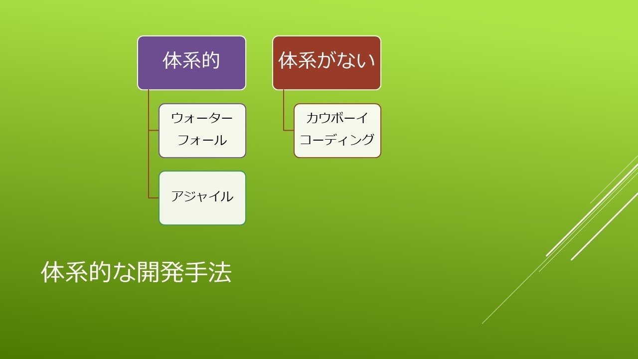 ウォーターフォールは、すべてを計画通りに進める手法であり、アジャイルは変化に対応するための体系的な手法です。一方、カウボーイコーディングは、勘や経験に頼る「行き当たりばったり」のスタイル。きちんとした枠組みがない分、ある意味で大胆な進め方とも言えますね。