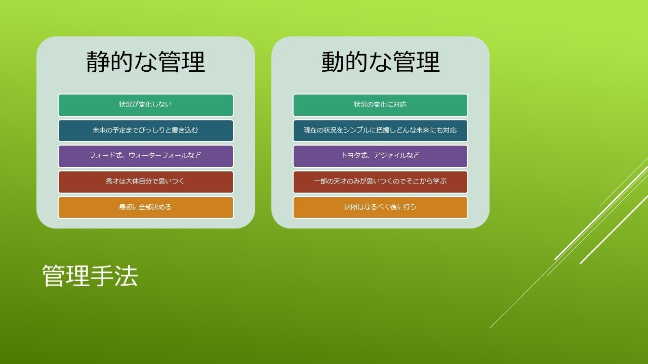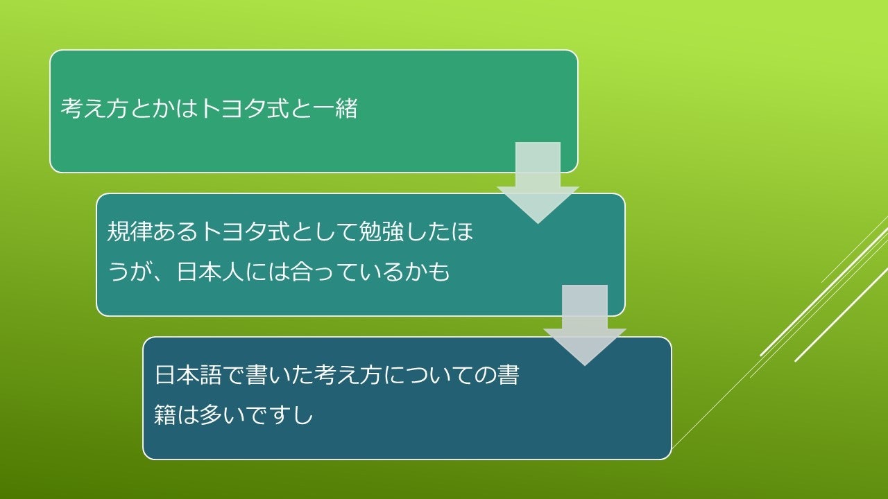 トヨタの昔の社長のエッセイなんかを読むと、アジャイルのエッセンスをよく理解できるかもしれません。「アジャイルは自由すぎて苦手」と感じる人には、トヨタ方式の本を読むことで、規律あるアジャイルを学ぶのも良いかもしれませんね。