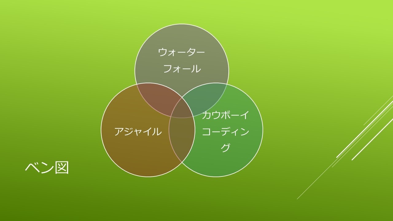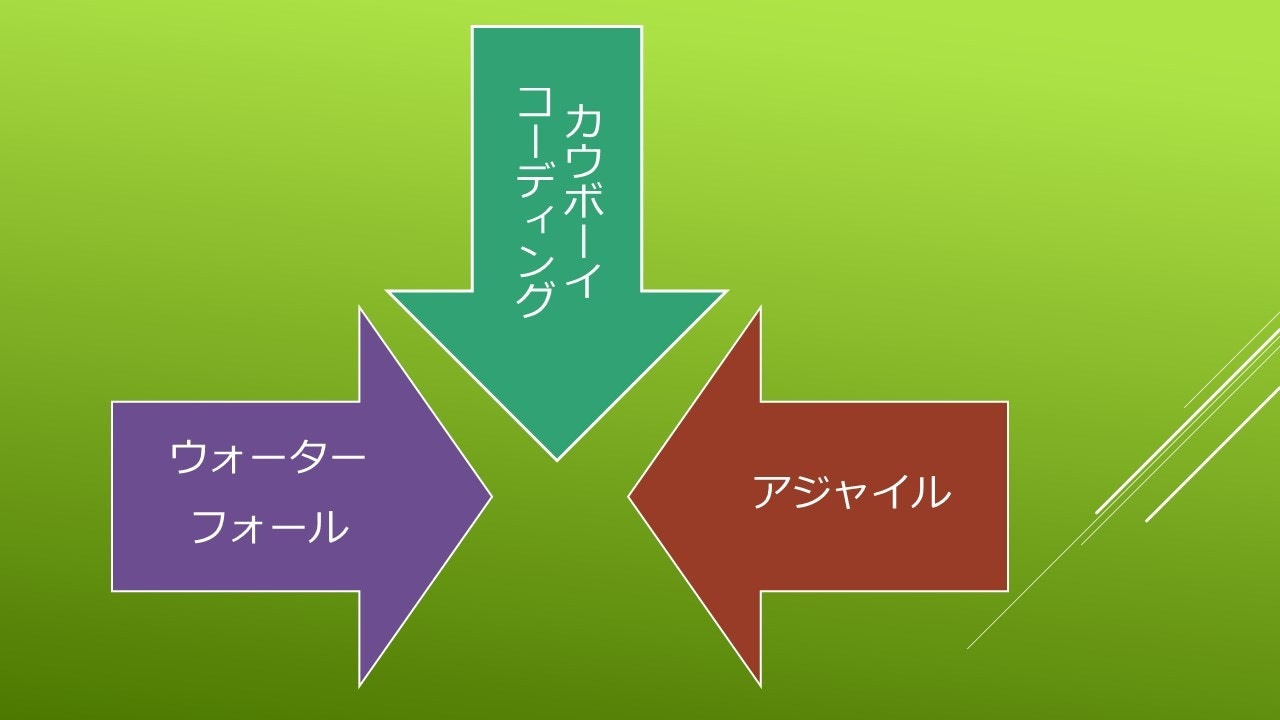 これら3つは、明確な境界で区別されるわけではなく、重なり合う部分もあります。例えば、アジャイルっぽいカウボーイコーディングや、ウォーターフォールっぽいアジャイルの手法など。こうした曖昧さが、議論を複雑にしているんですね。