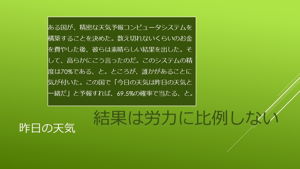 あるアジャイルの有名な例え話に「明日の天気予報」があります。大金をかけて作り上げた天気予報システムが、実際の精度は70%だと公表されました。ところが、誰かが「今日の天気は昨日と同じだ」と予測しても、69.5%の精度で当たることに気づいたのです。つまり、頑張って予測を立てても、それほど結果が変わらないことがあるんです。
