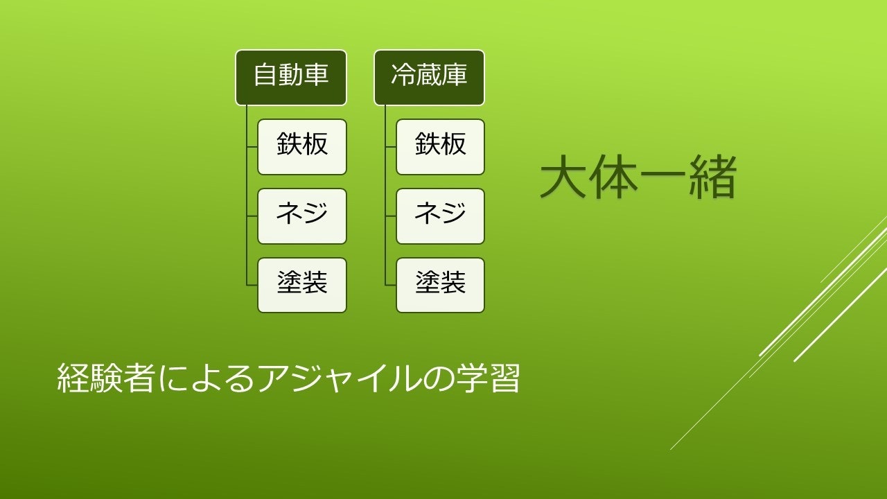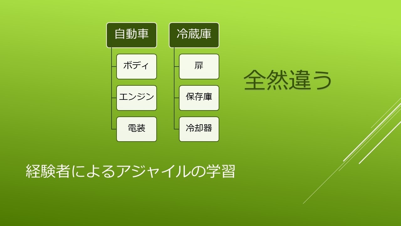 では、ウォーターフォールに慣れた人がアジャイルを学ぶとき、どんなことが起こるか考えてみましょう。例えるなら、自動車と冷蔵庫の違いのようなものです。最初はまったく異なるように見えます。