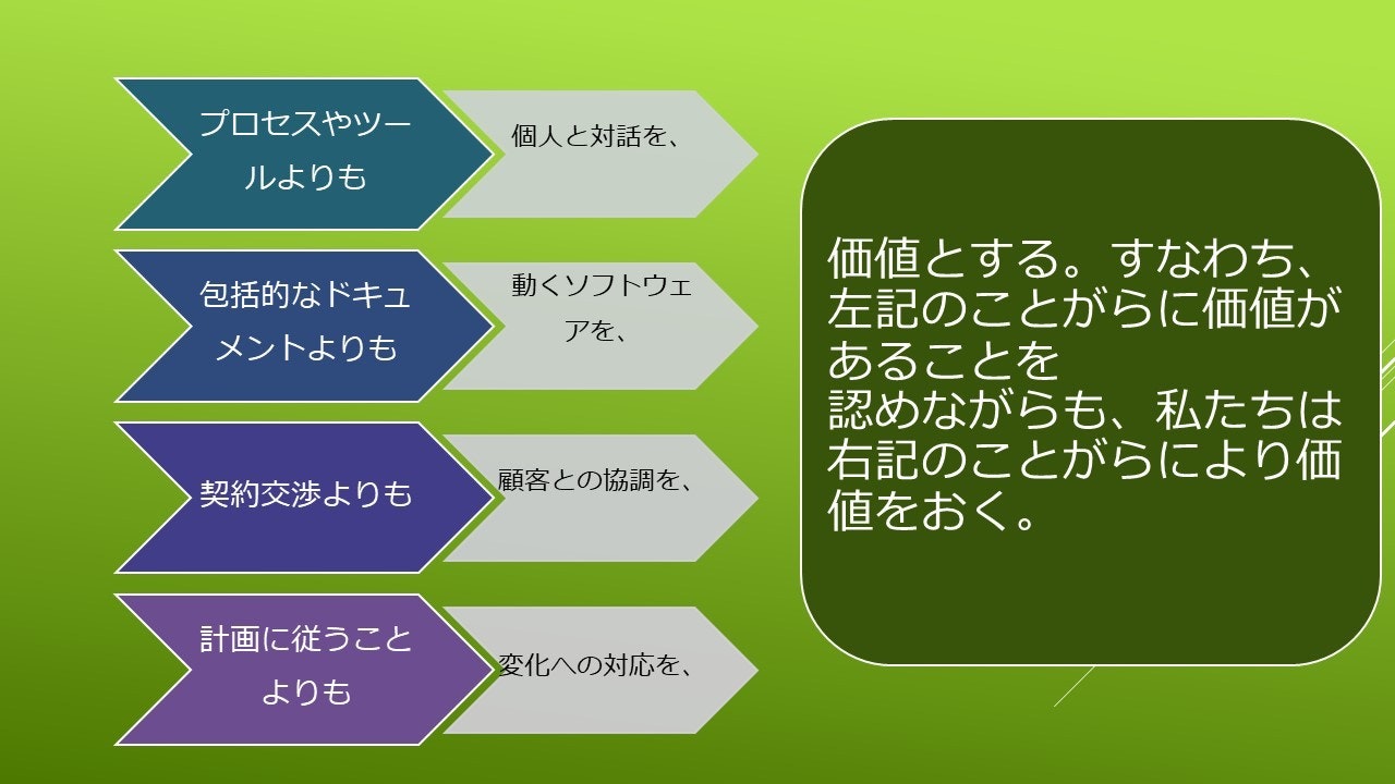 「私たちは、ソフトウェア開発の実践やそのサポートを通じて、より良い開発手法を見つけ出そうとしている。そしてこの活動を通して、以下の価値に至った。」