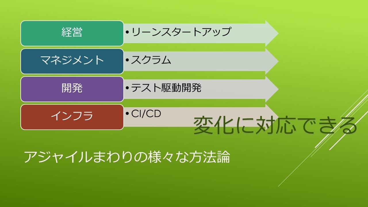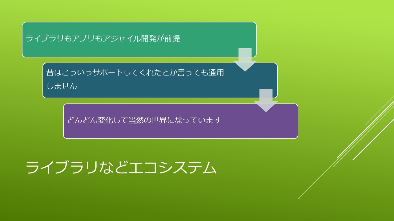 「欧米は欧米、日本は日本」という気持ちもわかりますが、普段使っているフレームワークやライブラリは多くが欧米で生まれたものです。もう、日本独自のウォーターフォール対応ライブラリでエコシステムを作り出す力はありません。アジャイルに合わせる時代が来ています。